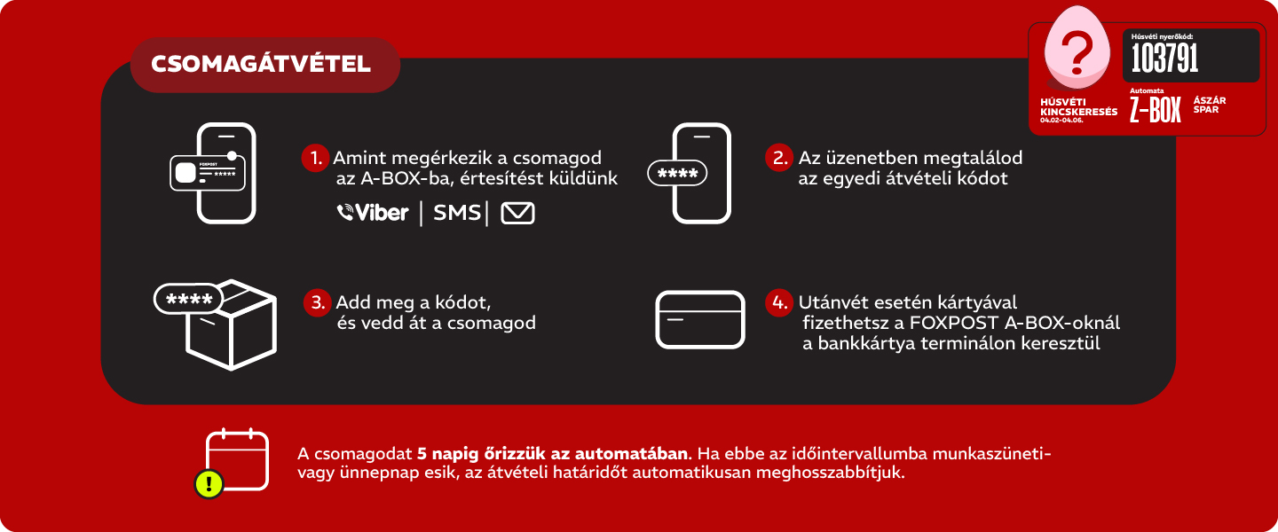 A csomagodat 5 napig őrizzük az automatában. Ha ebbe az időintervallumba munkaszüneti- vagy ünnepnap beleesik, úgy az átvételi határidőt automatikusan meghosszabbítjuk. Így akkor veheted át a csomagod, amikor számodra a legkényelmesebb!